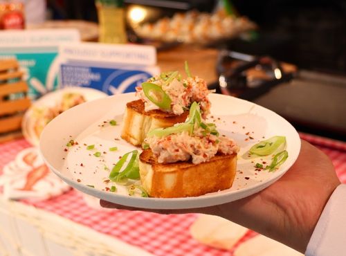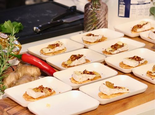 Camembert en tranches sur un biscuit belge Jules Destrooper®, garni de confiture de fruits de saison