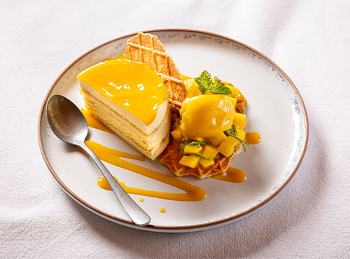 Servez des verrines de mousse au citron, yuzu, mangue et coco (123705) prêtes à l’emploi au lieu du bavarois aux fruits de la passion.