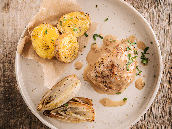 Konijn met Geuze, witloof en aardappelschijfjes