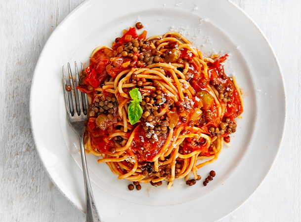 - Giet de spaghetti af en meng het door de linzen-bolognaisesaus.